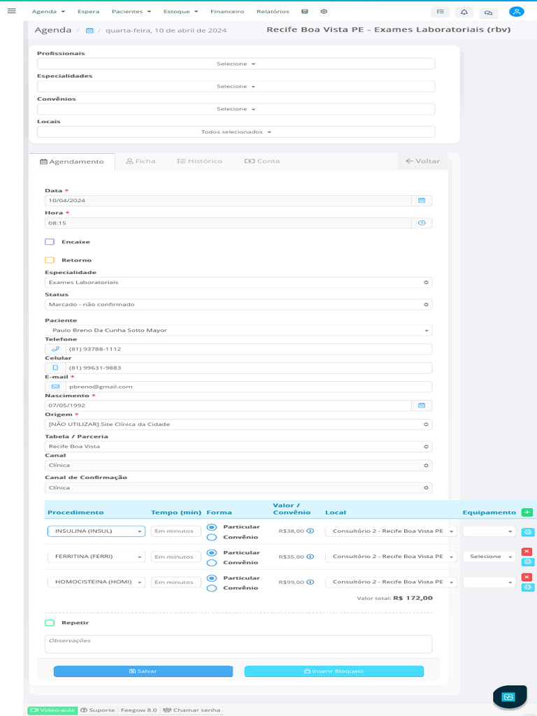 Agenda / / quarta-feira, 10 de abril de 2024 Recife Boa Vista PE - Exames Laboratoriais (rbv)