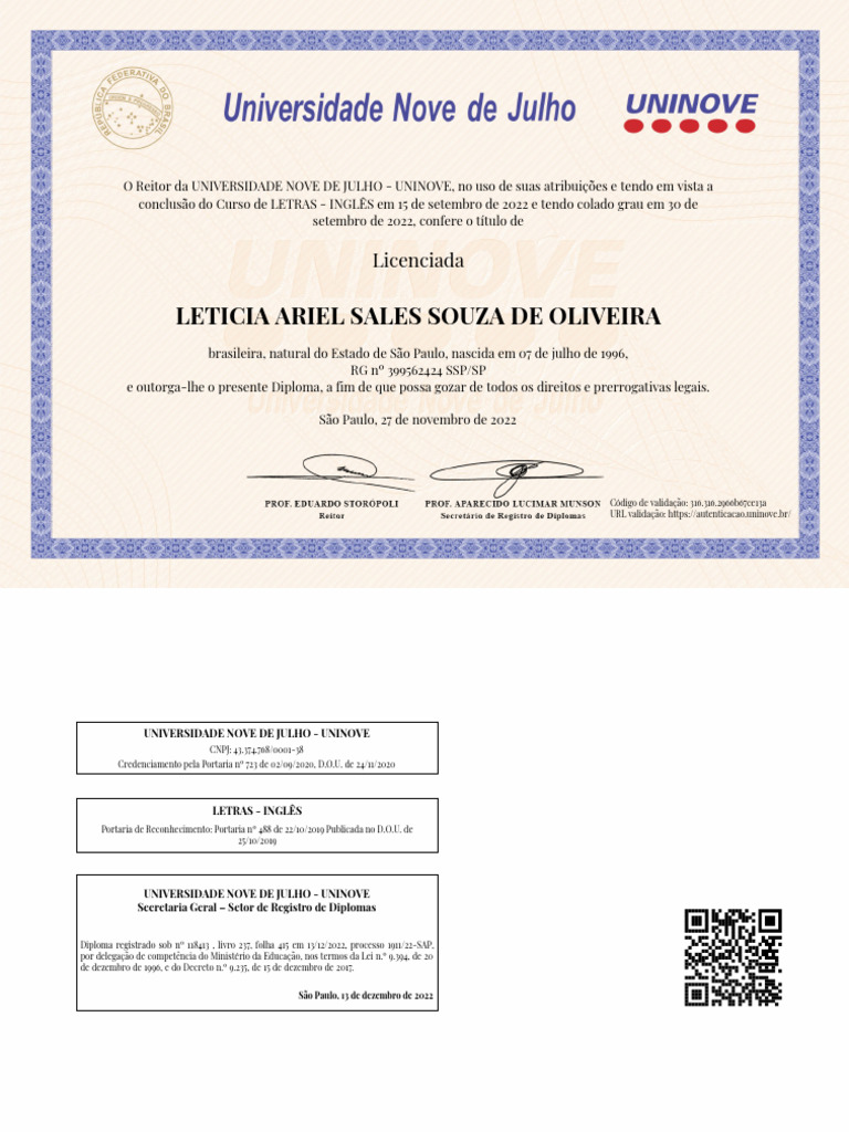 conclusão do Curso de LETRAS - INGLÊS em 15 de setembro de 2022 e tendo colado grau em 30 de