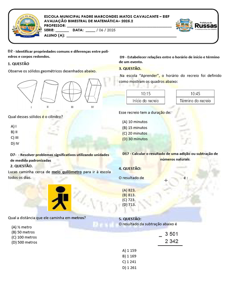 AVALIAÇÃO BIMESTRAL DE MATEMÁTICA– 2025.2