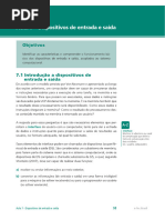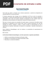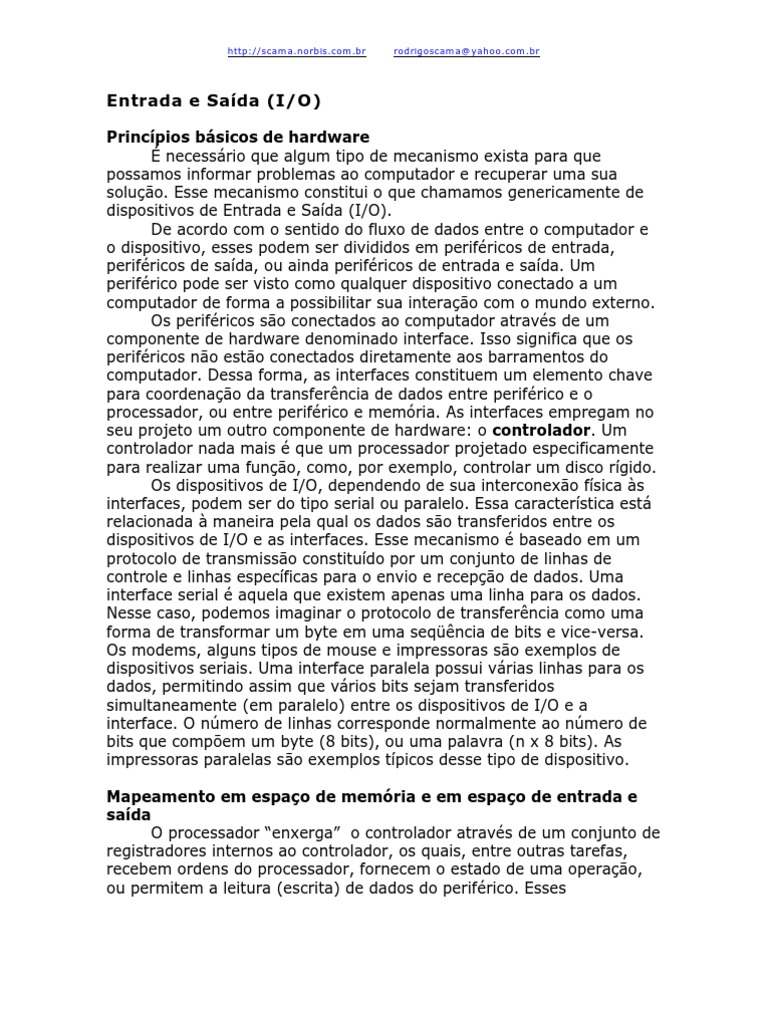 Princpios bsicos de hardware necessrio que algum tipo de mecanismo exista para que possamos informar problemas ao computador e recuperar uma sua soluo. Esse mecanismo constitui o que chamamos genericamente de dispositivos de Entrada e Sada (I/O). De acordo com o sentido do fluxo de dados entre o computador e o dispositivo, esses podem ser divididos em perifricos de entrada, perifricos de sada, ou ainda perifricos de entrada e sada. Um perifrico pode ser visto como qualquer dispositivo conectado a um computador de forma a possibilitar sua interao com o mundo externo. Os perifricos so conectados ao computador atravs de um componente de hardware denominado interface. Isso significa que os perifricos no esto conectados diretamente aos barramentos do computador. Dessa forma, as interfaces constituem um elemento chave para coordenao da transferncia de dados entre perifrico e o processador, ou entre perifrico e memria. As interfaces empregam no seu projeto um outro componente de hardware: o controlador. Um controlador nada mais que um processador projetado especificamente para realizar uma funo, como, por exemplo, controlar um disco rgido. Os dispositivos de I/O, dependendo de sua interconexo fsica s interfaces, podem ser do tipo serial ou paralelo. Essa caracterstica est relacionada maneira pela qual os dados so transferidos entre os dispositivos de I/O e as interfaces. Esse mecanismo baseado em um protocolo de transmisso constitudo por um conjunto de linhas de controle e linhas especficas para o envio e recepo de dados. Uma interface serial aquela que existem apenas uma linha para os dados. Nesse caso, podemos imaginar o protocolo de transferncia como uma forma de transformar um byte em uma seqncia de bits e vice-versa. Os modems, alguns tipos de mouse e impressoras so exemplos de dispositivos seriais. Uma interface paralela possui vrias linhas para os dados, permitindo assim que vrios bits sejam transferidos simultaneamente (em paralelo) entre os dispositivos de I/O e a interface. O nmero de linhas corresponde normalmente ao nmero de bits que compem um byte (8 bits), ou uma palavra (n x 8 bits). As impressoras paralelas so exemplos tpicos desse tipo de dispositivo. Mapeamento em espao de memria e em espao de entrada e sada O processador enxerga o controlador atravs de um conjunto de registradores internos ao controlador, os quais, entre outras tarefas, recebem ordens do processador, fornecem o estado de uma operao, ou permitem a leitura (escrita) de dados do perifrico. Esses