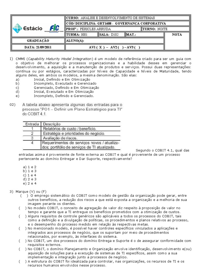 Segundo o COBIT 4.1, qual das entradas acima proveniente de fonte externa ao COBIT e qual proveniente de um processo pertencente ao domnio Entregar e Dar Suporte, respectivamente? a) 1 e 2 b) 1 e 3 c) 1 e 4 d) 2 e 3 e) 2 e 4 3) Marque (V) ou (F) ( ) O emprego sistemtico do COBIT como modelo de gesto da organizao pode gerar, entre outros benefcios, a reduo dos riscos a que est exposta a organizao e a melhoria de sua imagem perante os clientes. ( ) No modelo COBIT, o conceito de agregao de valor diz respeito proposio de valor no tempo e garante que a TI entregue os benefcios prometidos com a otimizao de custos. ( ) Alguns requisitos de controle genricos so aplicveis a todos os processos do COBIT, tais como a definio e a divulgao de polticas, os procedimentos e planos relativos ao processo, e o desempenho do processo medido em relao s respectivas metas. ( ) No mencionado modelo, possvel haver controles especficos vinculados a aplicaes e integrados aos processos de negcio, que os suportam por meio de procedimentos relacionados, por exemplo, s interfaces do sistema. ( ) No COBIT, um dos processos do domnio Entrega e Suporte o de assegurar conformidade com requisitos externos. ( ) No COBIT, o domnio Planejamento e Organizao envolve identificao, desenvolvimento e(ou) aquisio de solues para a execuo de sistemas de TI especficos, assim como a sua implementao e integrao junto a processos de negcio. ( ) A estrutura do COBIT foi idealizada para controlar, nas organizaes, os recursos de TI e os recursos humanos envolvidos nesse processo.