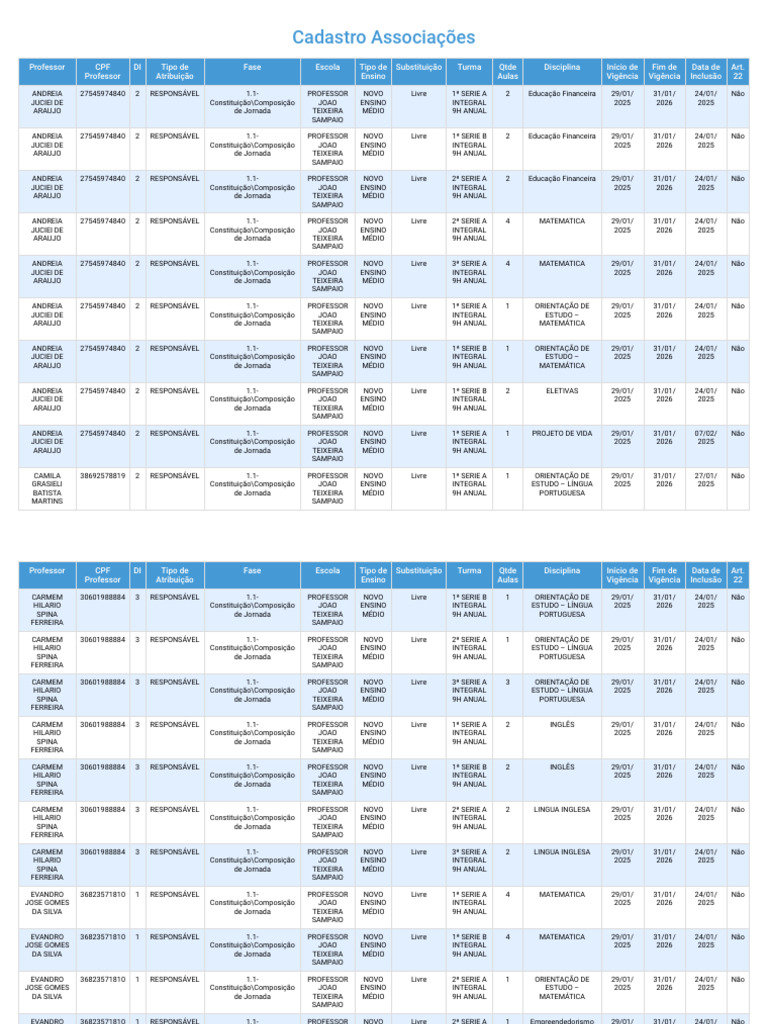 MARIA 43557874869 1 RESPONSÁVEL 1.3-Carga Horária PROFESSOR NOVO Livre 1ª SERIE B 2 ARTE 29/01/ 31/01/ 24/01/ Não