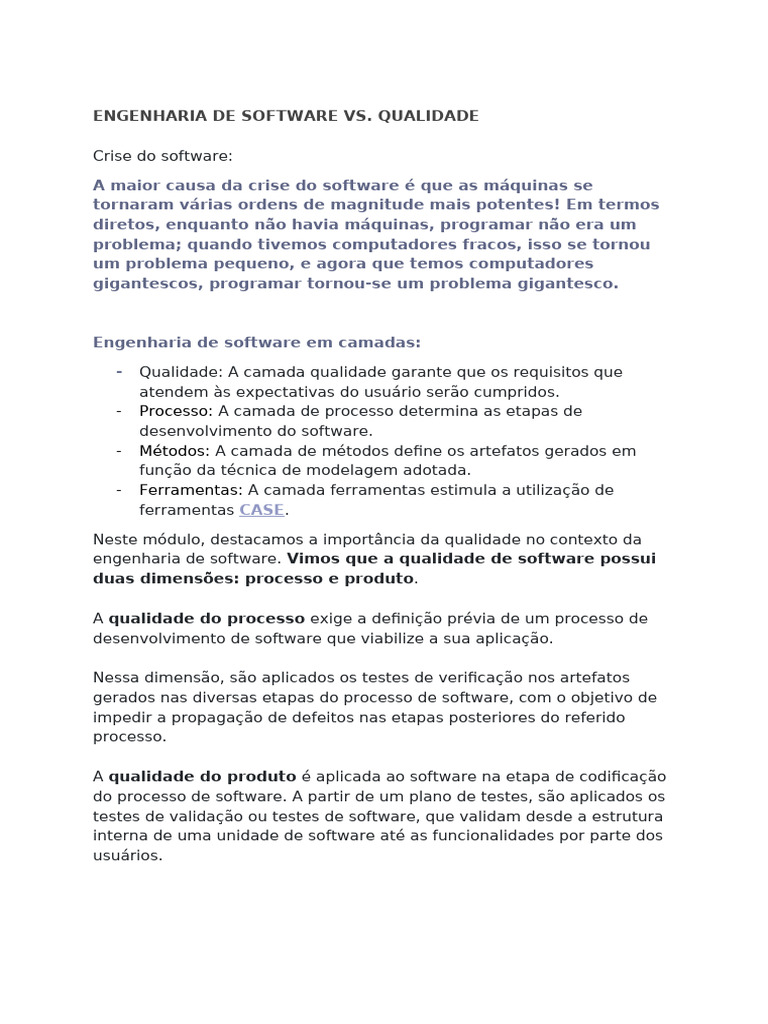 engenharia de software. Vimos que a qualidade de software possui