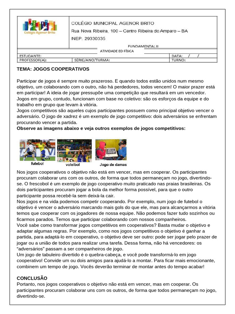 se. O frescobol é um exemplo de jogo cooperativo muito praticado nas praias brasileiras. Os