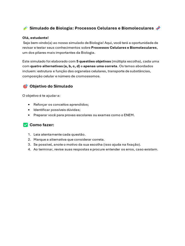 Simulado de Biologia: Processos Celulares e Biomoleculares