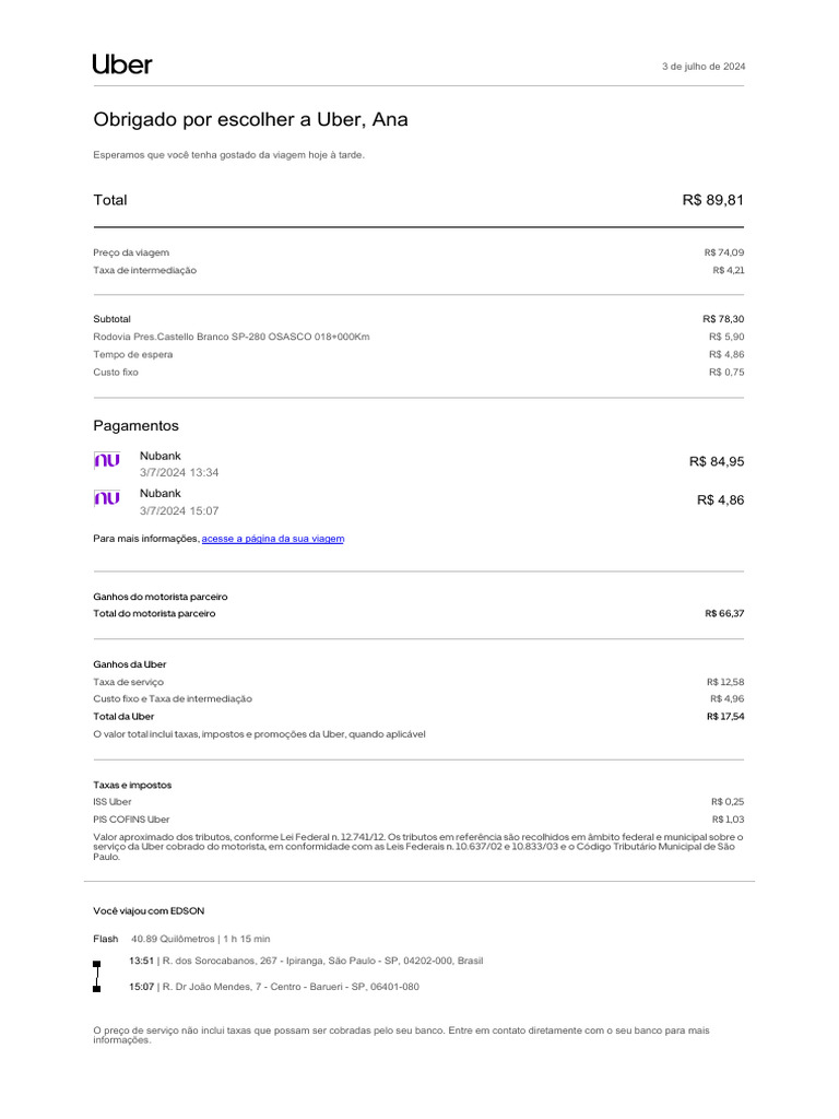 Obrigado por escolher a Uber, Ana