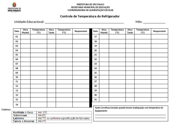 Ações Corretivas tomadas quando houver inadequação com temperatura do