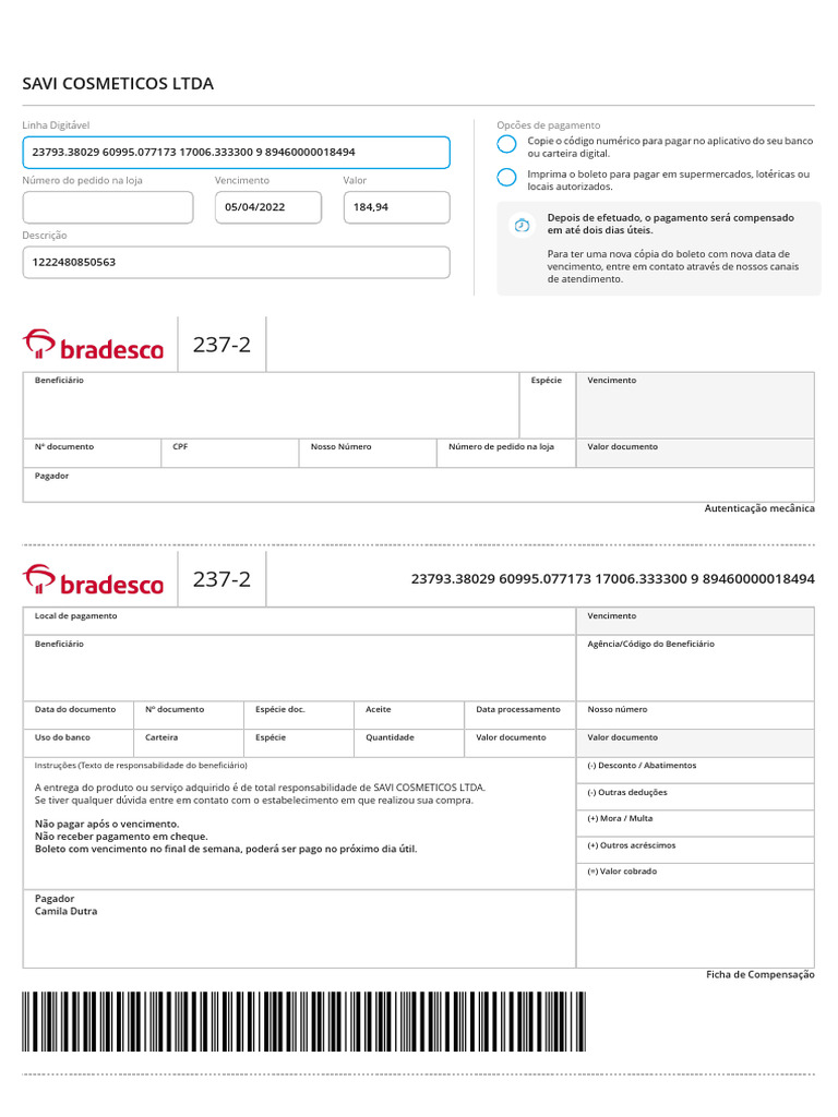Nº documento CPF Nosso Número Número de pedido na loja Valor documento