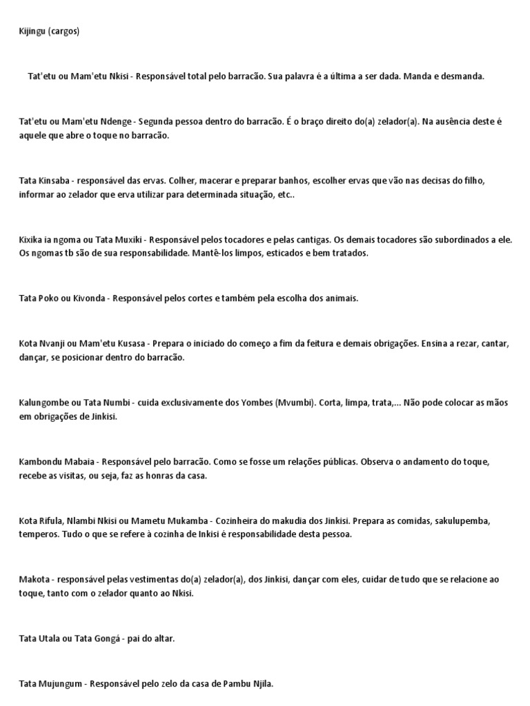 Tata Kinsaba - responsvel das ervas. Colher, macerar e preparar banhos, escolher ervas que vo nas decisas do filho, informar ao zelador que erva utilizar para determinada situao, etc..