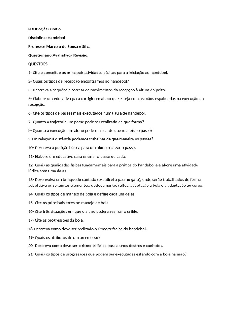 12- Quais as qualidades físicas fundamentais para a prática do handebol e elabore uma atividade