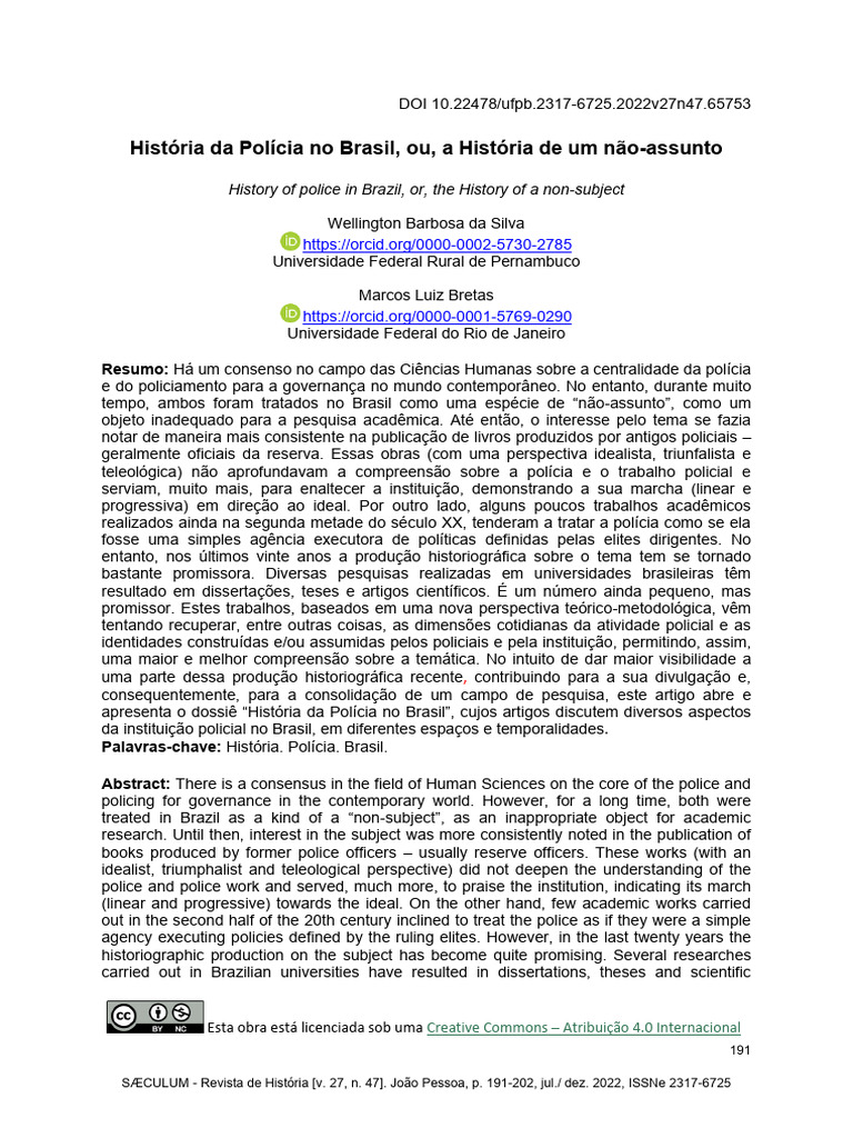 and presents the dossier “The History of Police in Brazil”, whose topics discuss various
