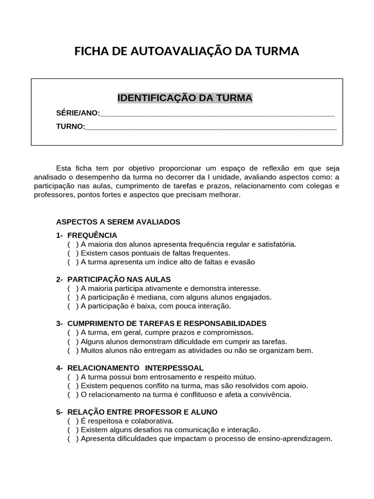 FICHA DE AUTOAVALIAÇÃO DA TURMA