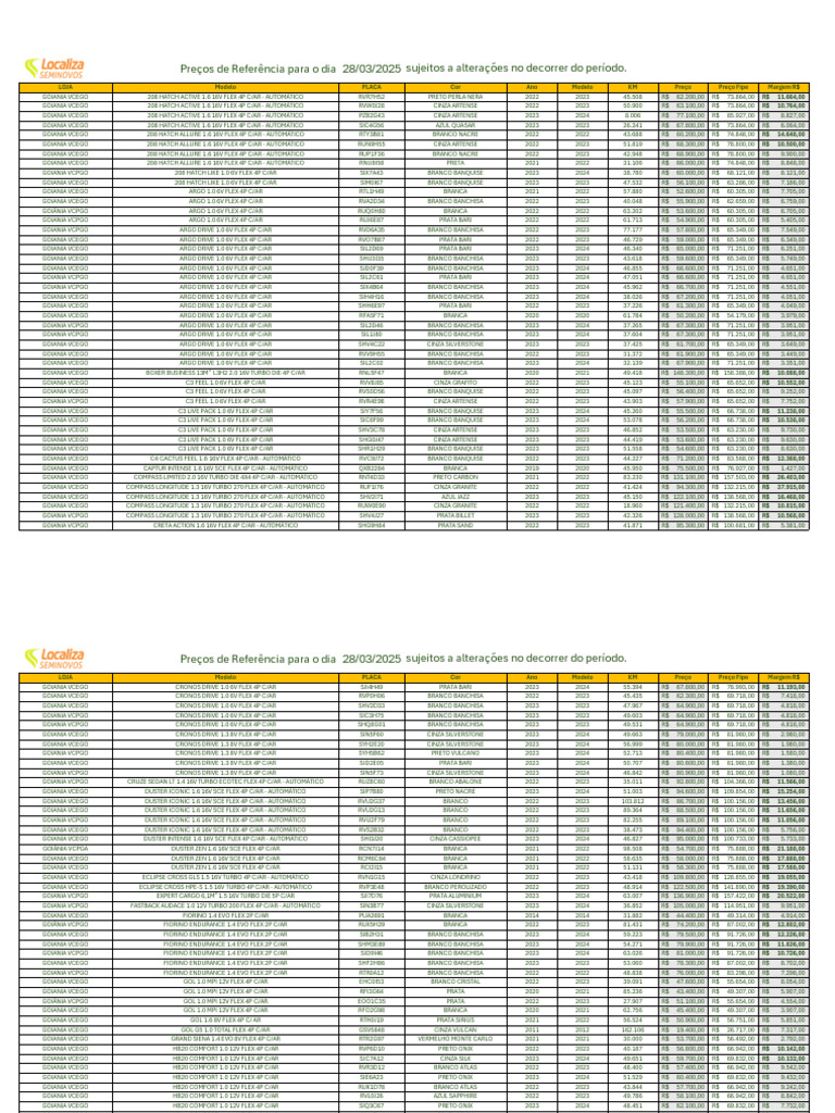 LOJA Modelo PLACA Cor Ano Modelo KM Preço Preço Fipe Margem R$