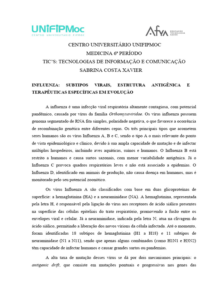 INFLUENZA: SUBTIPOS VIRAIS, ESTRUTURA ANTIGÊNICA E