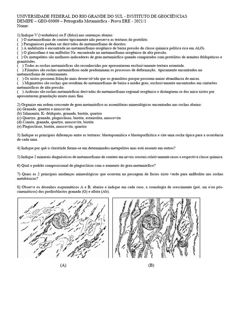DEMIPE – GEO-03009 – Petrografia Metamórfica - Prova ERE - 2021/1