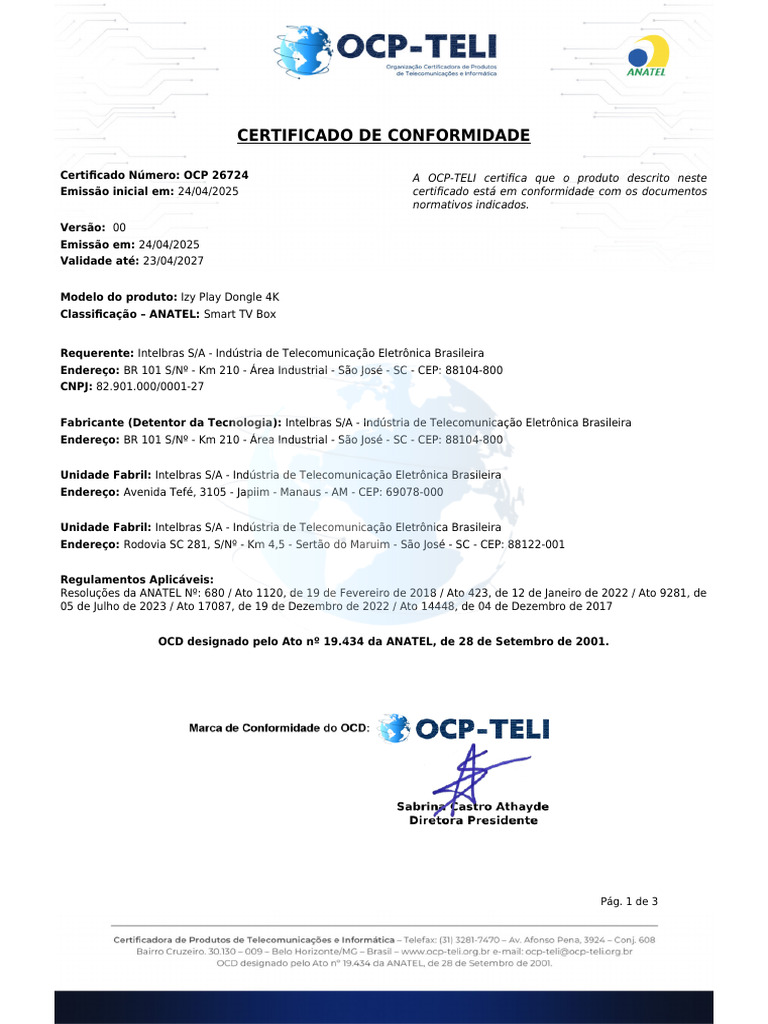 Certificado Número: OCP 26724 A OCP-TELI certifica que o produto descrito neste