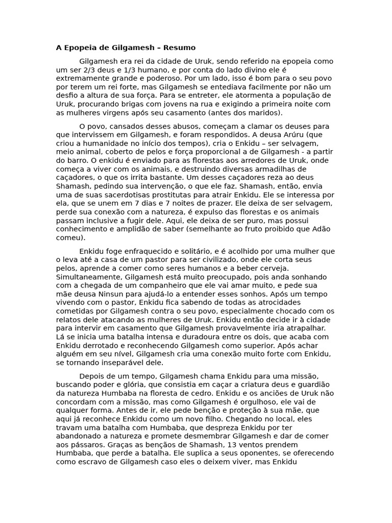 criou a humanidade no início dos tempos), cria o Enkidu – ser selvagem,