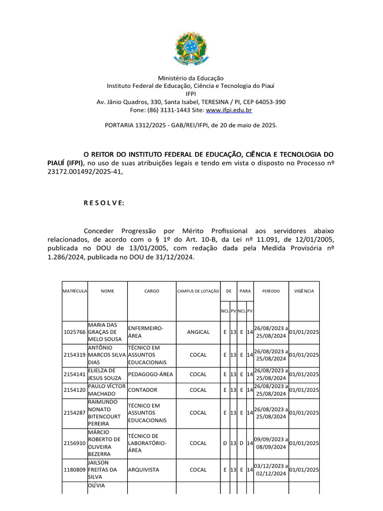 PIAUÍ (IFPI), no uso de suas atribuições legais e tendo em vista o disposto no Processo nº