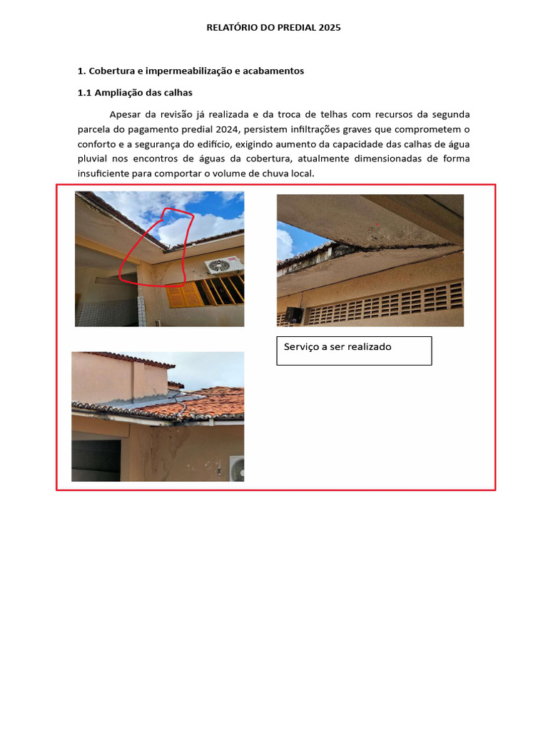 de cobertura onde fica as calhas e nas paredes externas para evitar novas recorrências