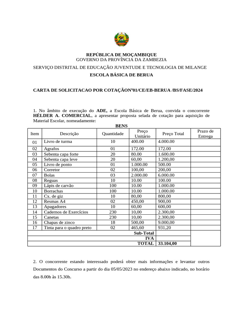 1. No âmbito de execução do ADE, a Escola Básica de Berua, convida ao concorrente Bely