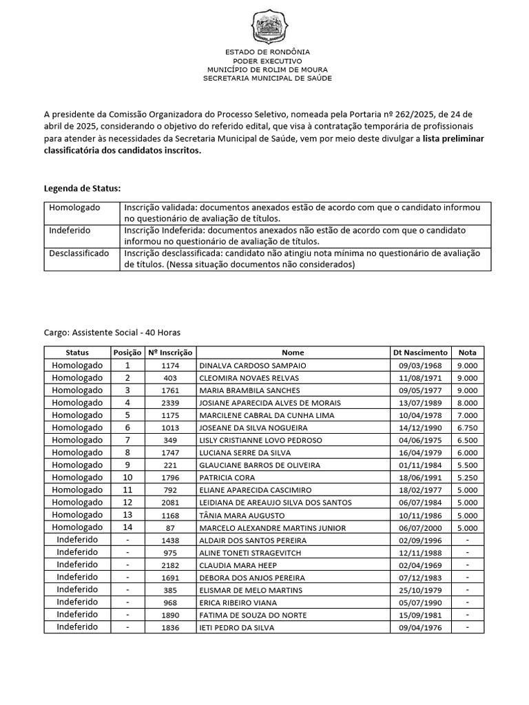 para atender às necessidades da Secretaria Municipal de Saúde, vem por meio deste divulgar a lista preliminar