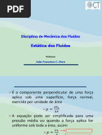 3.1 - Lei da Conservao de Energia (Teorema de Bernoulli) Esse teorema foi estabelecido por Bernoulli em 1738 e relaciona as energias potenciais e cinticas de um fluido ideal ou seja, sem viscosidade e incompressvel. Atravs desse teorema pode-se concluir que para um fluido perfeito, toda forma de energia pode ser transformada em outra, permanecendo constante sua somatria ao longo de uma linha de corrente. Assim sua equao representativa : P1 + . V21 + . g . h1 = P2 + . V22 + g . h2 = cte Essa equao pode ser simplificada em funo das seguintes situaes: a) Se a corrente for constante na direo horizontal, teremos: P1 + . V21 = P2 + . V22 = cte b) Se a velocidade nula e assim o fluido se encontra em repouso, teremos: P1 + gh1 = P2 + gh2 = cte 3.2 - Teorema de Stevin Esse teorema foi estabelecido por STEVIN e relaciona as presses estticas exercidas por um fluido em repouso com a altura da coluna do mesmo em um determinado reservatrio. Seu enunciado diz: A diferena de presso entre dois pontos de um fluido em repouso igual ao produto do peso especfico do fluido pela diferena de cota entre os dois pontos.