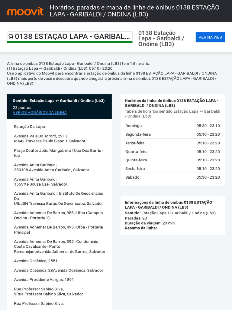 Sentido: Estação Lapa ↔ Garibaldi / Ondina (Lb3) Horários da linha de ônibus 0138 ESTAÇÃO LAPA -