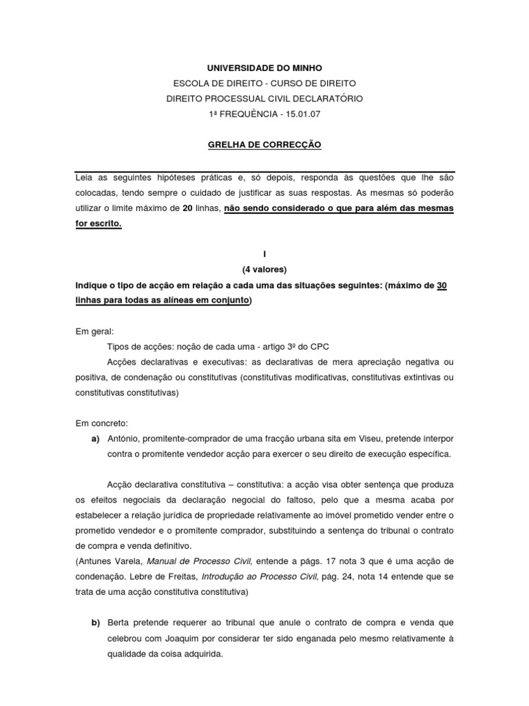 UNIVERSIDADE DO MINHO ESCOLA DE DIREITO - CURSO DE DIREITO DIREITO PROCESSUAL CIVIL DECLARATRIO 1 FREQUNCIA - 15.01.