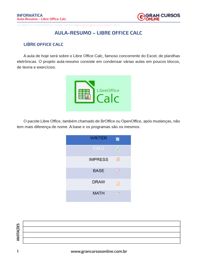 Aula-Resumo – Libre Office Calc