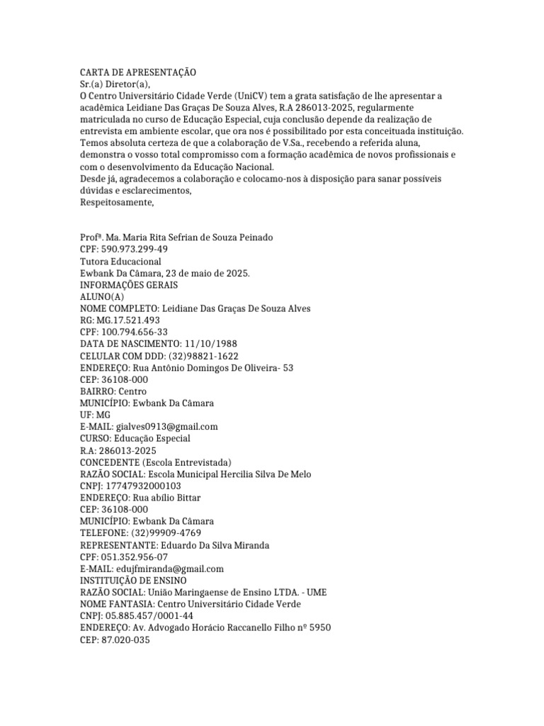 Temos absoluta certeza de que a colaboração de [Link]., recebendo a referida aluna,