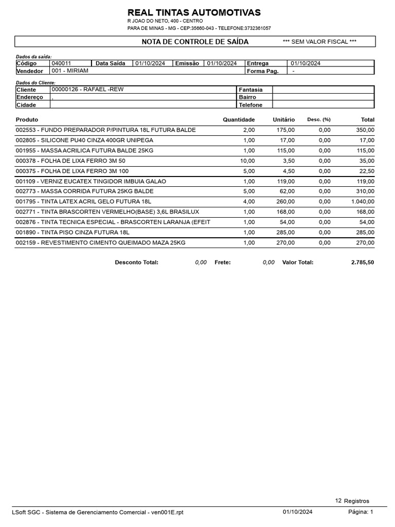 Código 040011 Data Saída 01/10/2024 Emissão 01/10/2024 Entrega 01/10/2024