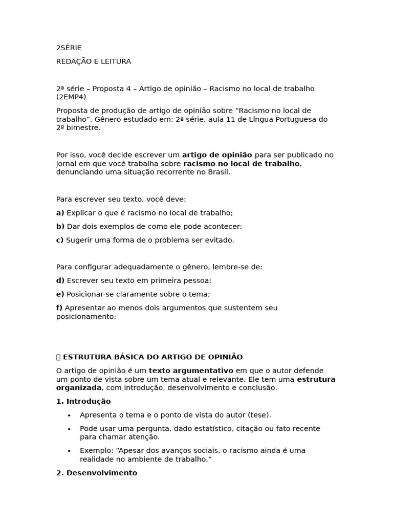 2ª série – Proposta 4 – Artigo de opinião – Racismo no local de trabalho