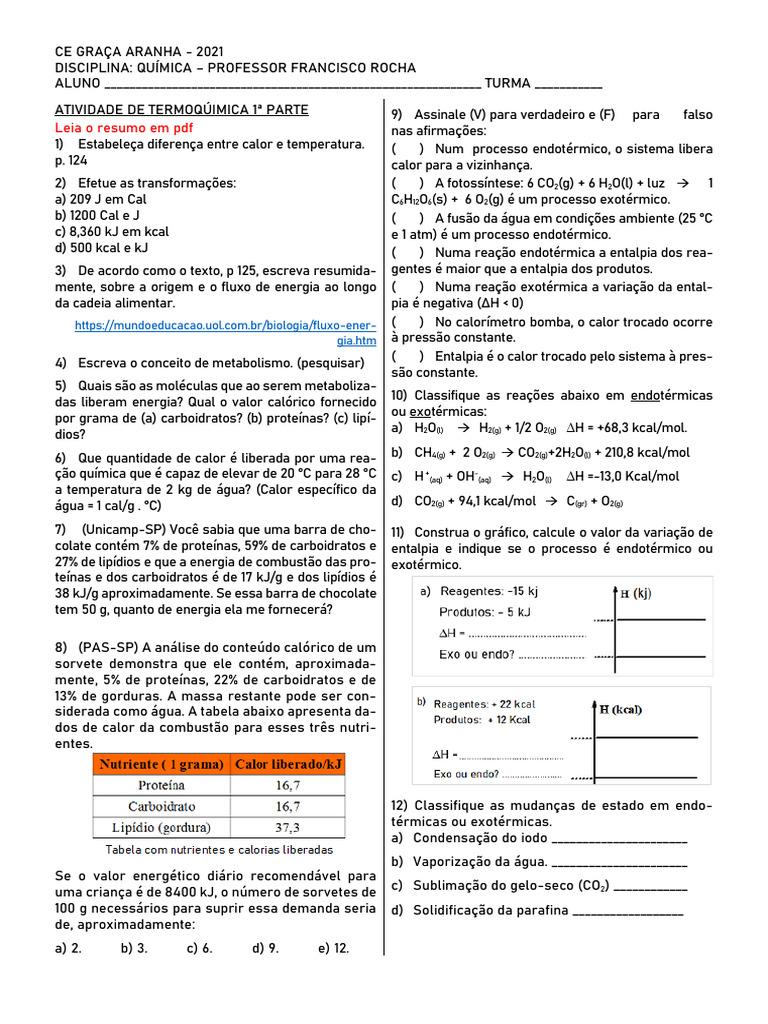 4) Escreva o conceito de metabolismo. (pesquisar) ( ) Entalpia é o calor trocado pelo sistema à pres-