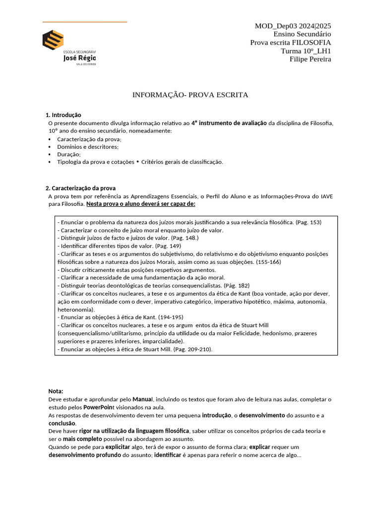 O presente documento divulga informação relativo ao 4º instrumento de avaliação da disciplina de Filosofia,