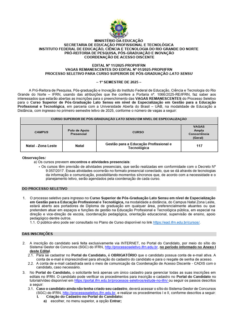 Grande do Norte – IFRN, usando das atribuições que lhe confere a Portaria nº. 1066/2025-RE/IFRN, faz saber aos