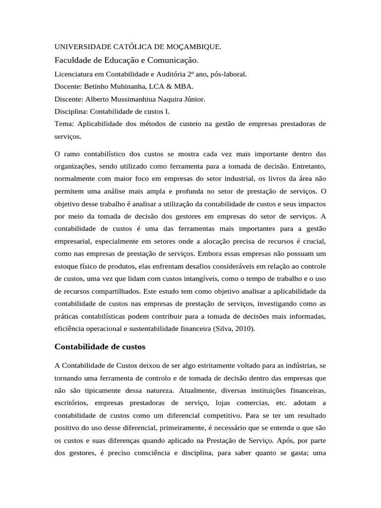 os custos e suas diferenças quando aplicado na Prestação de Serviço. Após, por parte