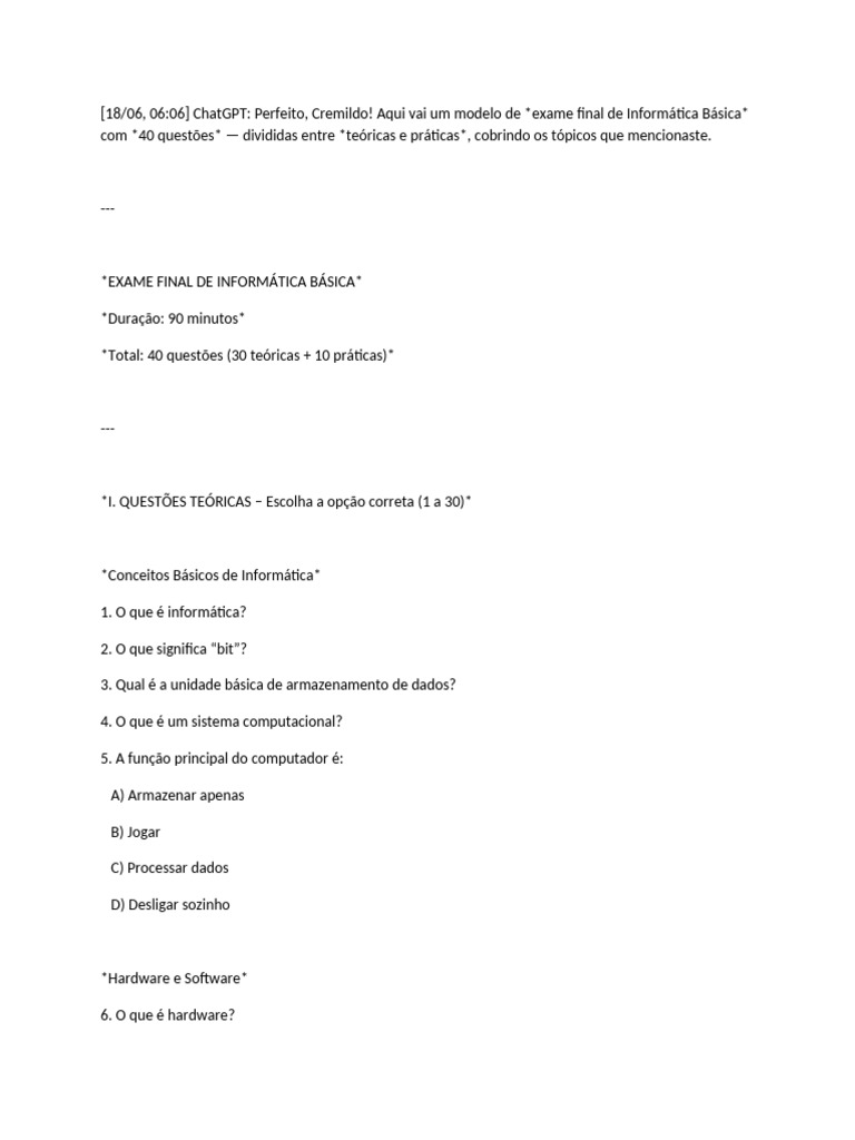 [18/06, 06:01] Meta AI: Aqui estão 40 questões para o exame final de informática básica, incluindo