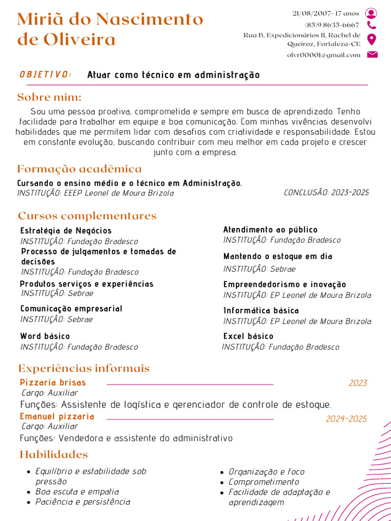 Cursando o ensino médio e o técnico em Administração.