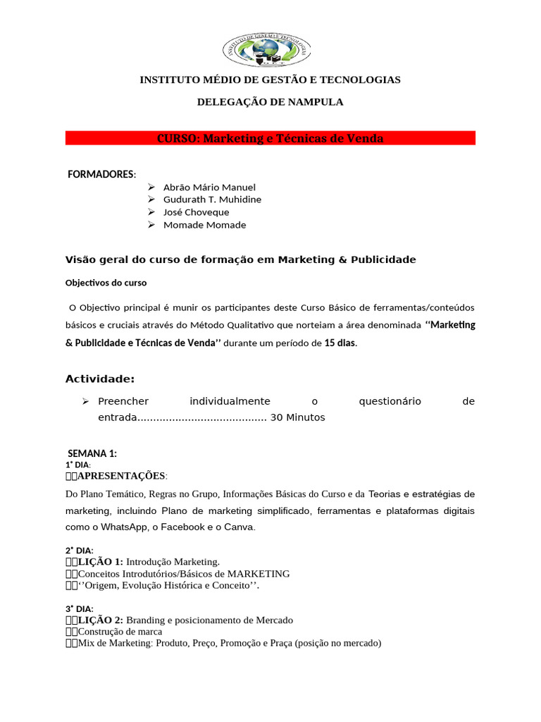 CURSO: Marketing e Técnicas de Venda
