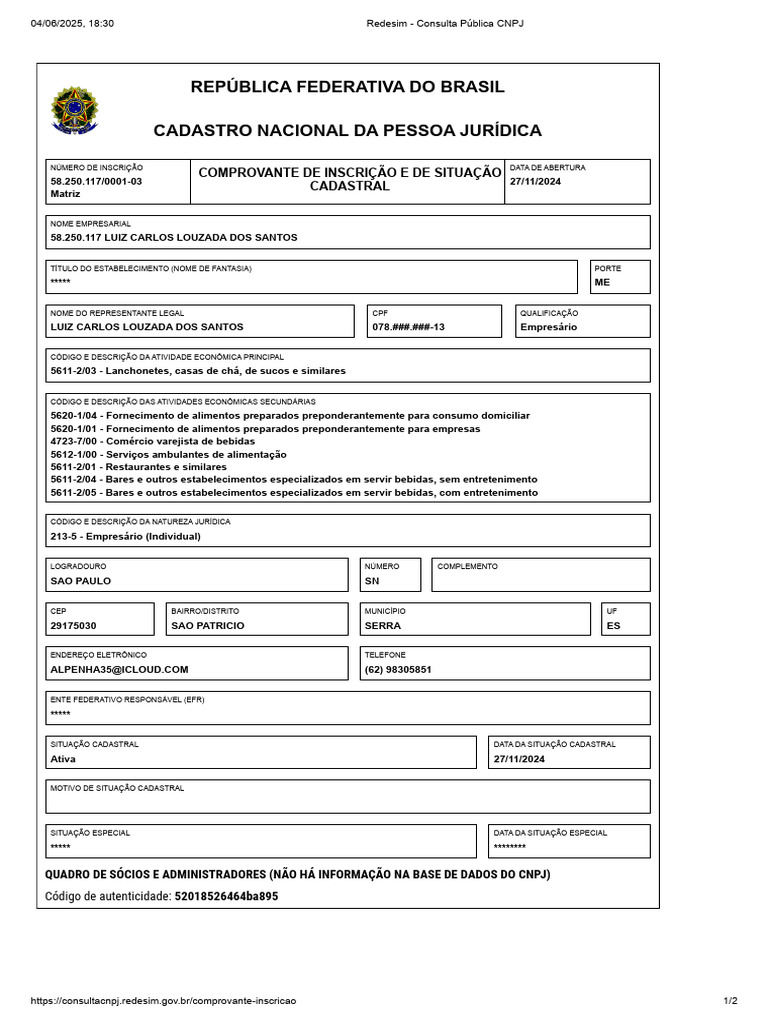 04/06/2025, 18:30 Redesim - Consulta Pública CNPJ