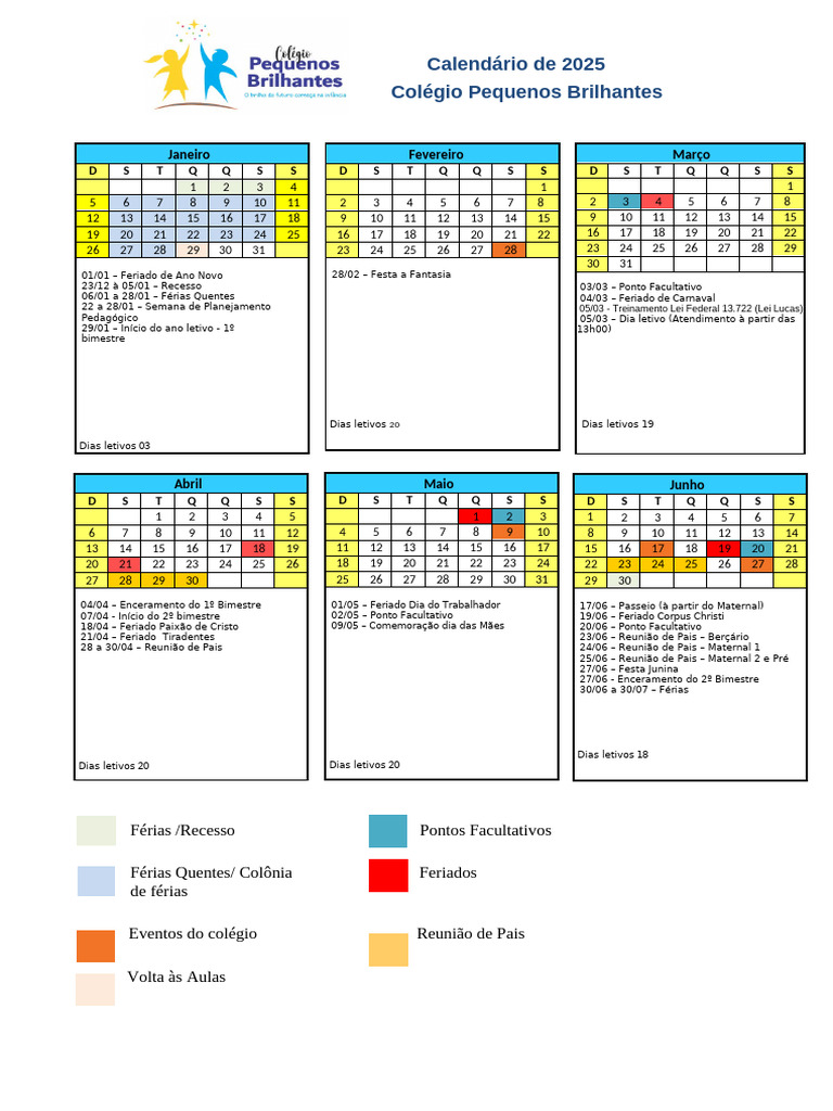 04/04 – Enceramento do 1º Bimestre 01/05 – Feriado Dia do Trabalhador 17/06 – Passeio (à partir do Maternal)