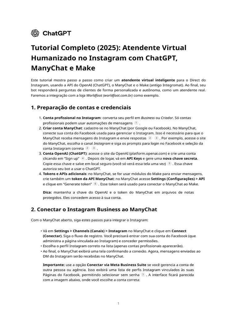 Instagram, usando a API do OpenAI (ChatGPT), o ManyChat e o Make (antigo Integromat). Ao final, seu