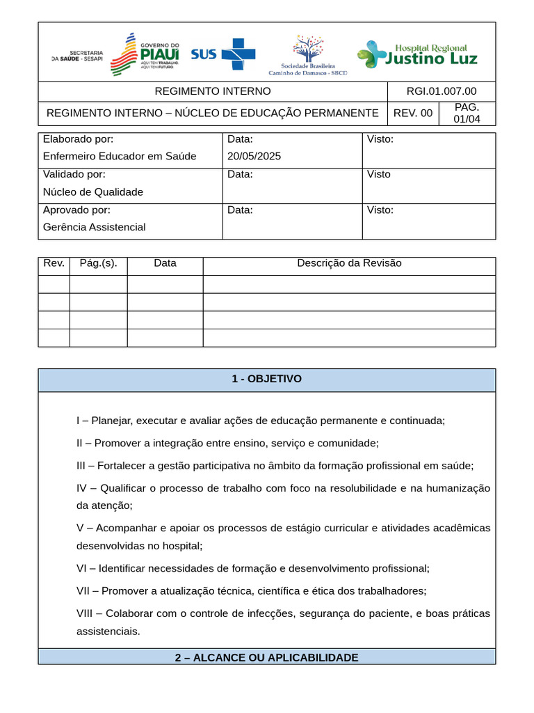 REGIMENTO INTERNO – NÚCLEO DE EDUCAÇÃO PERMANENTE REV. 00