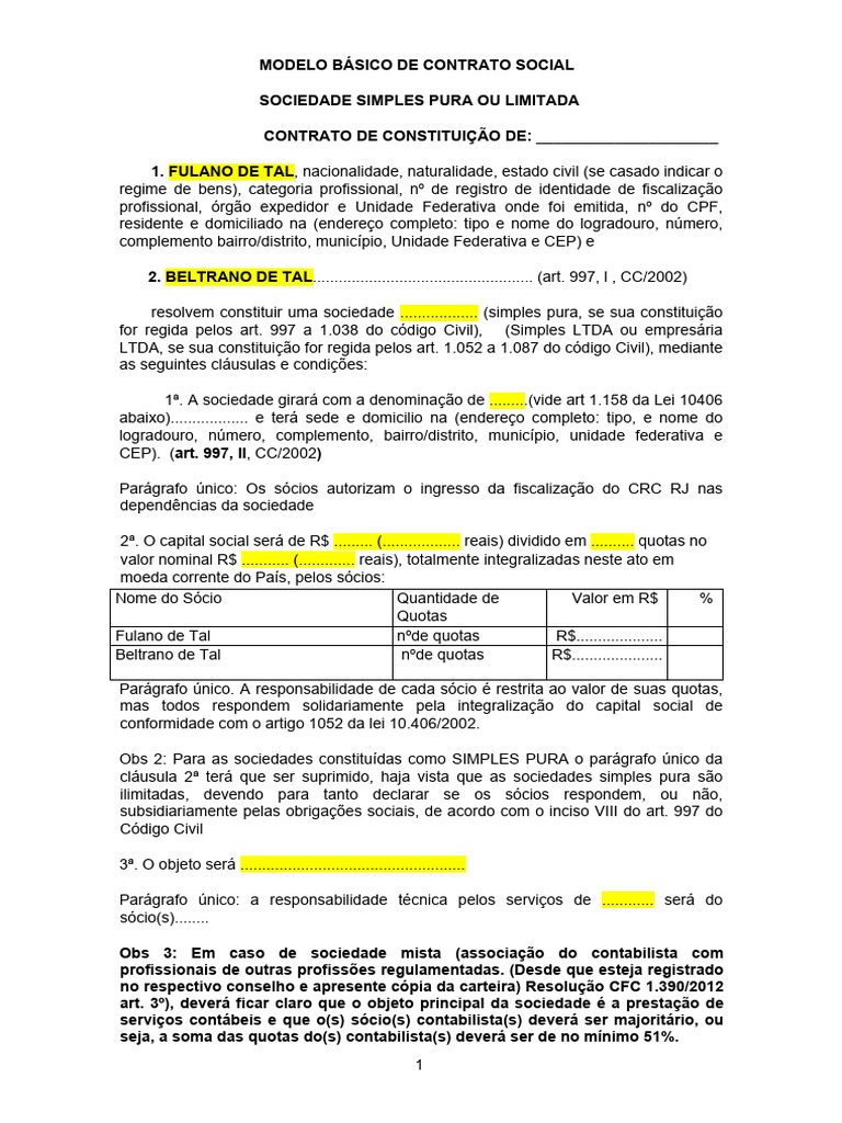 cláusula 2ª terá que ser suprimido, haja vista que as sociedades simples pura são