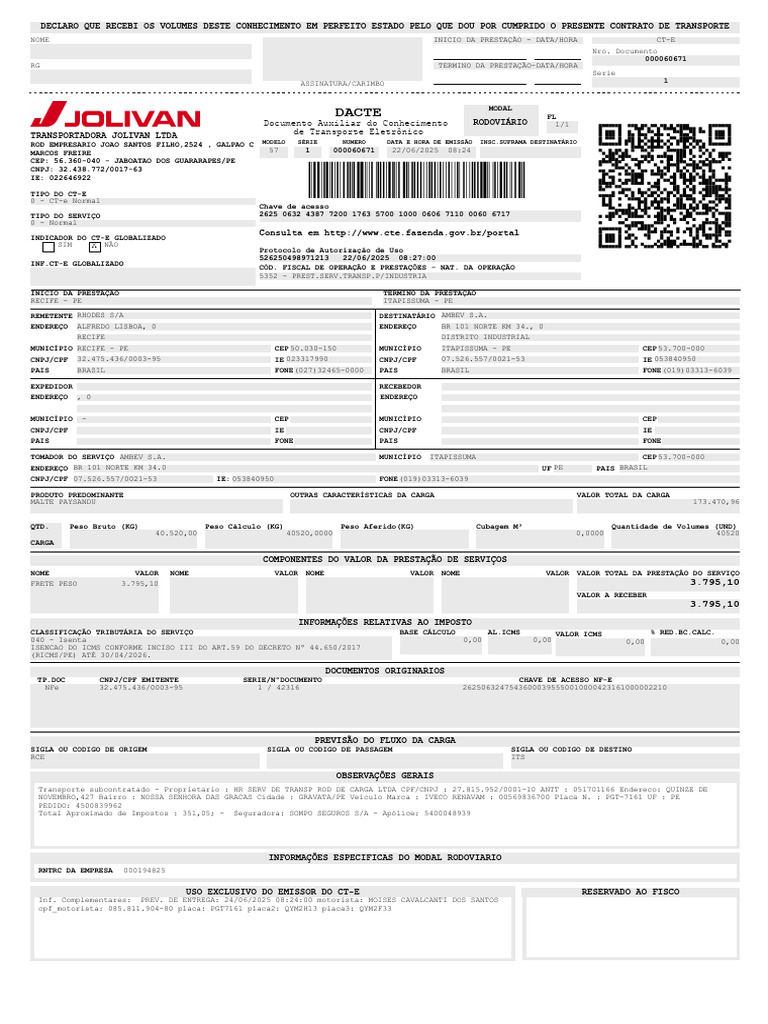 Inf. Complementares: PREV. DE ENTREGA: 24/06/2025 [Link] motorista: MOISES CAVALCANTI DOS SANTOS