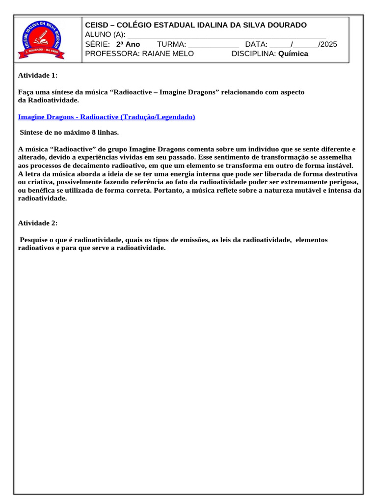 O documento contém atividades escolares sobre a música 'Radioactive' da banda Imagine Dragons, relacionando seus temas de transformação e energia interna com os conceitos de radioatividade. A primeira atividade pede uma síntese que compara a sensação de mudança do eu lírico com o decaimento radioativo. A segunda atividade solicita uma pesquisa sobre a definição de radioatividade, suas emissões, leis, elementos radioativos e suas aplicações.