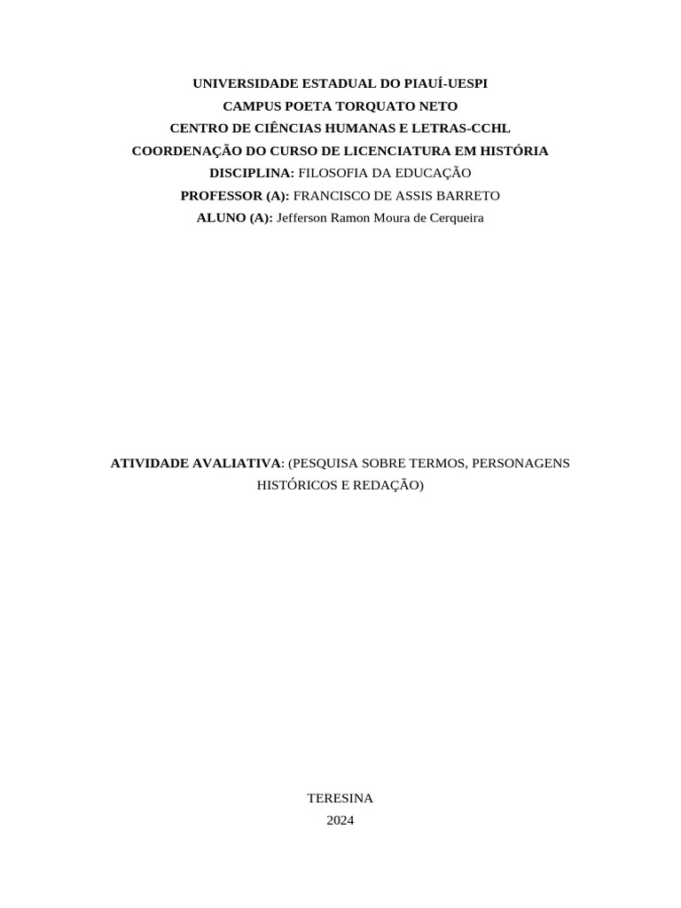 ATIVIDADE AVALIATIVA: (PESQUISA SOBRE TERMOS, PERSONAGENS