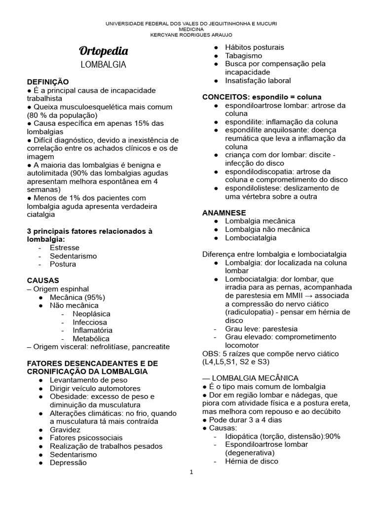 - Inflamação que afeta os tecidos ● Dor lombar aguda: tratar e aguardar