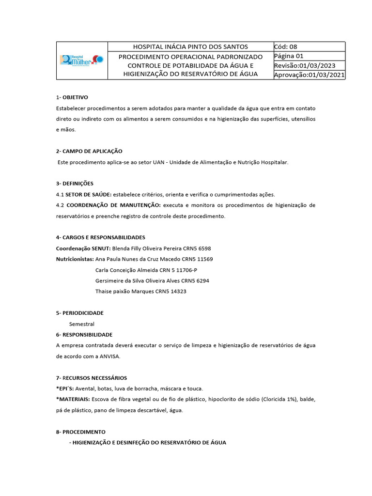 HIGIENIZAÇÃO DO RESERVATÓRIO DE ÁGUA Aprovação:01/03/2021