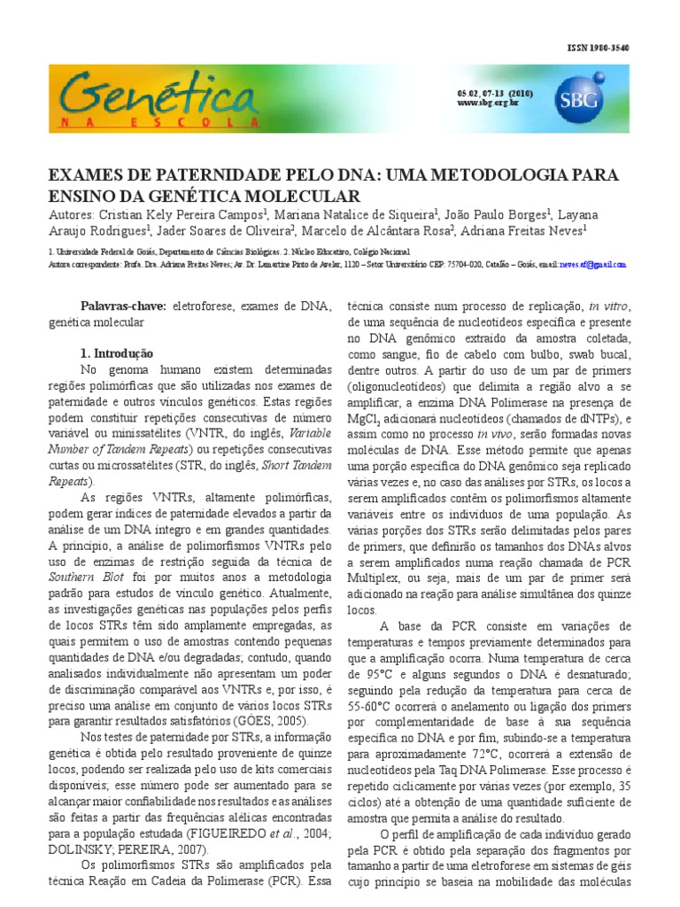 Palavras-chave: eletroforese, exames de DNA, gentica molecular 1. Introduo No genoma humano existem determinadas regies polimrficas que so utilizadas nos exames de paternidade e outros vnculos genticos. Estas regies podem constituir repeties consecutivas de nmero varivel ou minissatlites (VNTR, do ingls, Variable Number of Tandem Repeats) ou repeties consecutivas curtas ou microssatlites (STR, do ingls, Short Tandem Repeats). As regies VNTRs, altamente polimrficas, podem gerar ndices de paternidade elevados a partir da anlise de um DNA ntegro e em grandes quantidades. A princpio, a anlise de polimorfismos VNTRs pelo uso de enzimas de restrio seguida da tcnica de Southern Blot foi por muitos anos a metodologia padro para estudos de vnculo gentico. Atualmente, as investigaes genticas nas populaes pelos perfis de locos STRs tm sido amplamente empregadas, as quais permitem o uso de amostras contendo pequenas quantidades de DNA e/ou degradadas; contudo, quando analisados individualmente no apresentam um poder de discriminao comparvel aos VNTRs e, por isso, preciso uma anlise em conjunto de vrios locos STRs para garantir resultados satisfatrios (GES, 2005). Nos testes de paternidade por STRs, a informao gentica obtida pelo resultado proveniente de quinze locos, podendo ser realizada pelo uso de kits comerciais disponveis; esse nmero pode ser aumentado para se alcanar maior confiabilidade nos resultados e as anlises so feitas a partir das frequncias allicas encontradas para a populao estudada (FIGUEIREDO et al., 2004; DOLINSKY; PEREIRA, 2007). Os polimorfismos STRs so amplificados pela tcnica Reao em Cadeia da Polimerase (PCR). Essa